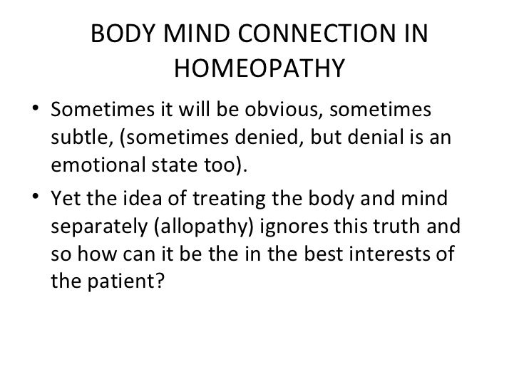 - 95. BODY MIND CONNECTION IN HOMEOPATHY• Sometimes it will be obvious, sometimes subtle, (sometimes denied, but denial is an emotional state too).• Yet the idea of treating the body and mind separately (allopathy) ignores this truth and so how can it be the in the best interests of the patient?