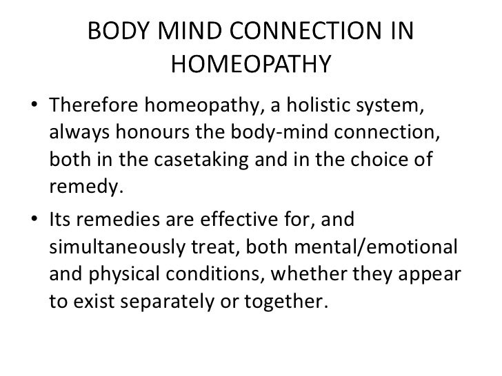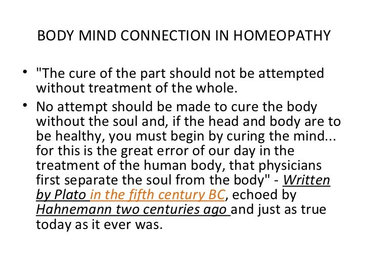 - 96. BODY MIND CONNECTION IN HOMEOPATHY• "The cure of the part should not be attempted without treatment of the whole.• No attempt should be made to cure the body without the soul and, if the head and body are to be healthy, you must begin by curing the mind... for this is the great error of our day in the treatment of the human body, that physicians first separate the soul from the body" - Written by Plato in the fifth century BC, echoed by Hahnemann two centuries ago and just as true today as it ever was.