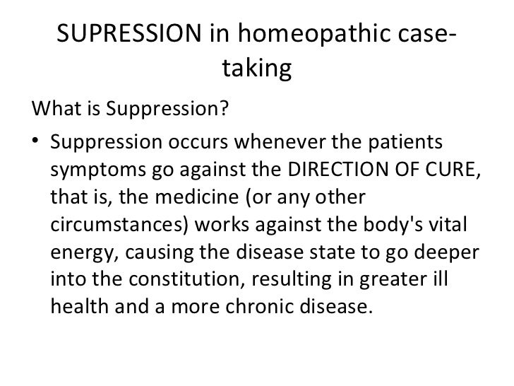 - 98. SUPRESSION in homeopathic case- takingWhat is Suppression?• Suppression occurs whenever the patients symptoms go against the DIRECTION OF CURE, that is, the medicine (or any other circumstances) works against the bodys vital energy, causing the disease state to go deeper into the constitution, resulting in greater ill health and a more chronic disease.