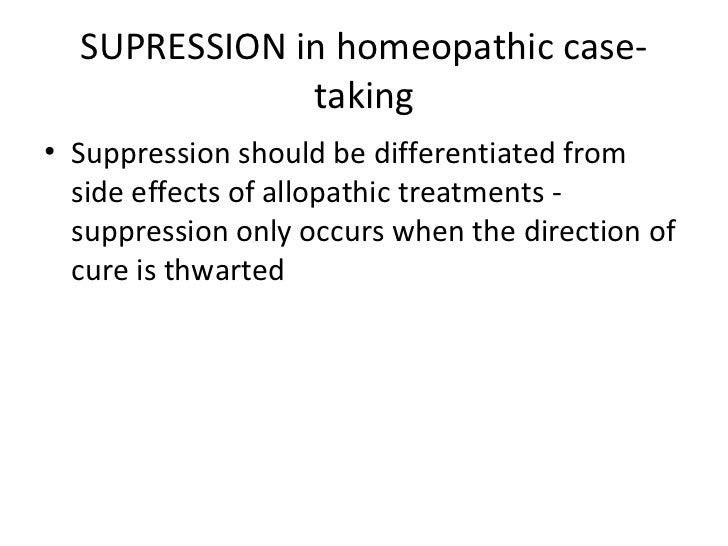 - 101. SUPRESSION in homeopathic case- taking• Suppression should be differentiated from side effects of allopathic treatments - suppression only occurs when the direction of cure is thwarted