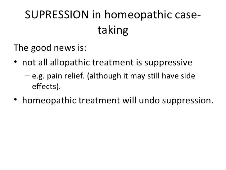 - 100. SUPRESSION in homeopathic case- taking• The consequences of suppression are widespread and homeopathic literature is bedecked with cases illustrating how a patients suffering has been increased as a result of allopathic suppression