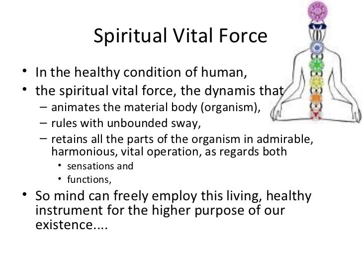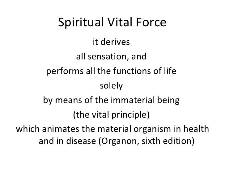 - 13. Spiritual Vital Force it derives all sensation, and performs all the functions of life solely by means of the immaterial being (the vital principle)which animates the material organism in health and in disease (Organon, sixth edition)