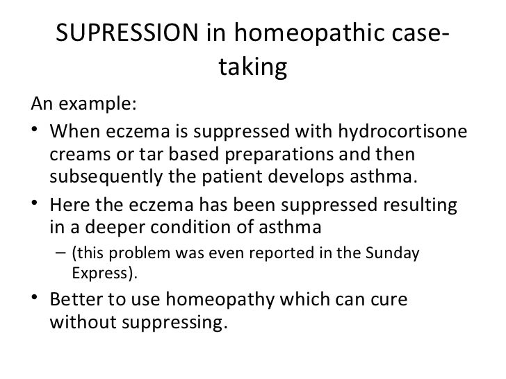 - 103. SUPRESSION in homeopathic case- takingAn example:• When eczema is suppressed with hydrocortisone creams or tar based preparations and then subsequently the patient develops asthma.• Here the eczema has been suppressed resulting in a deeper condition of asthma – (this problem was even reported in the Sunday Express).• Better to use homeopathy which can cure without suppressing.