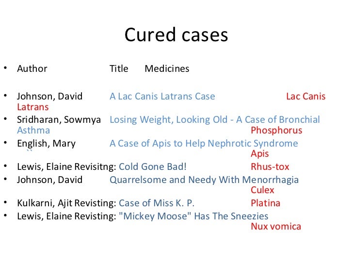 - 105. Cured cases• Author Title Medicines• Johnson, David A Lac Canis Latrans Case Lac Canis Latrans• Sridharan, Sowmya Losing Weight, Looking Old - A Case of Bronchial Asthma Phosphorus• English, Mary A Case of Apis to Help Nephrotic Syndrome `` Apis• Lewis, Elaine Revisitng: Cold Gone Bad! Rhus-tox• Johnson, David Quarrelsome and Needy With Menorrhagia Culex• Kulkarni, Ajit Revisting: Case of Miss K. P. Platina• Lewis, Elaine Revisting: "Mickey Moose" Has The Sneezies Nux vomica