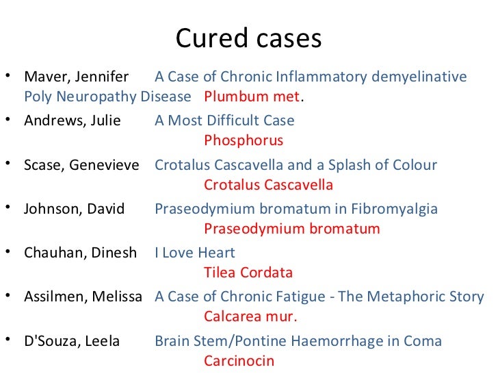 - 106. Cured cases• Maver, Jennifer A Case of Chronic Inflammatory demyelinative Poly Neuropathy Disease Plumbum met.• Andrews, Julie A Most Difficult Case Phosphorus• Scase, Genevieve Crotalus Cascavella and a Splash of Colour Crotalus Cascavella• Johnson, David Praseodymium bromatum in Fibromyalgia Praseodymium bromatum• Chauhan, Dinesh I Love Heart Tilea Cordata• Assilmen, Melissa A Case of Chronic Fatigue - The Metaphoric Story Calcarea mur.• DSouza, Leela Brain Stem/Pontine Haemorrhage in Coma Carcinocin