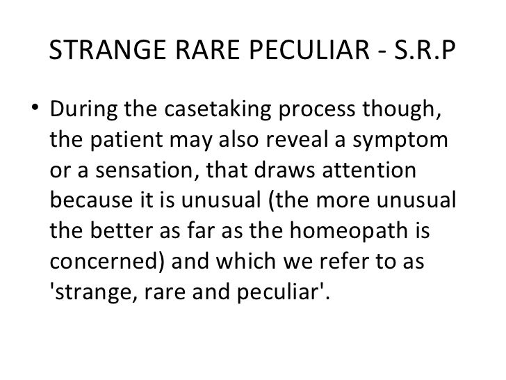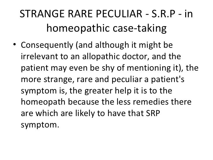 - 111. STRANGE RARE PECULIAR - S.R.P - in homeopathic case-taking• Consequently (and although it might be irrelevant to an allopathic doctor, and the patient may even be shy of mentioning it), the more strange, rare and peculiar a patients symptom is, the greater help it is to the homeopath because the less remedies there are which are likely to have that SRP symptom.
