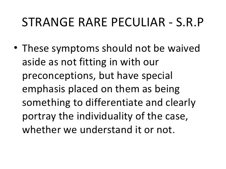 - 108. STRANGE RARE PECULIAR - S.R.P• These symptoms should not be waived aside as not fitting in with our preconceptions, but have special emphasis placed on them as being something to differentiate and clearly portray the individuality of the case, whether we understand it or not.