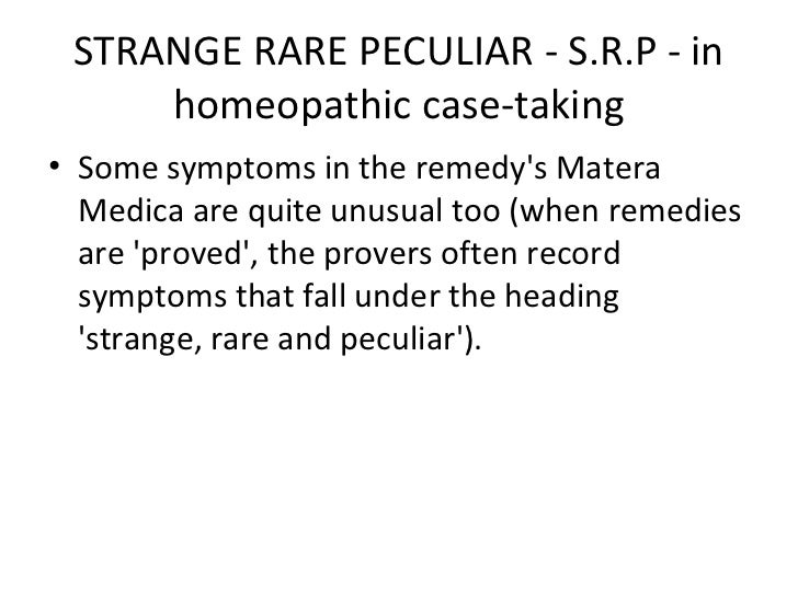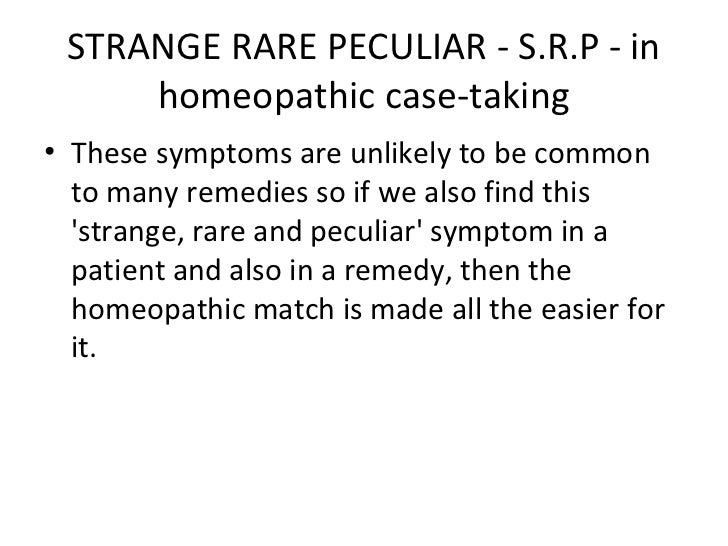- 110. STRANGE RARE PECULIAR - S.R.P - in homeopathic case-taking• These symptoms are unlikely to be common to many remedies so if we also find this strange, rare and peculiar symptom in a patient and also in a remedy, then the homeopathic match is made all the easier for it.