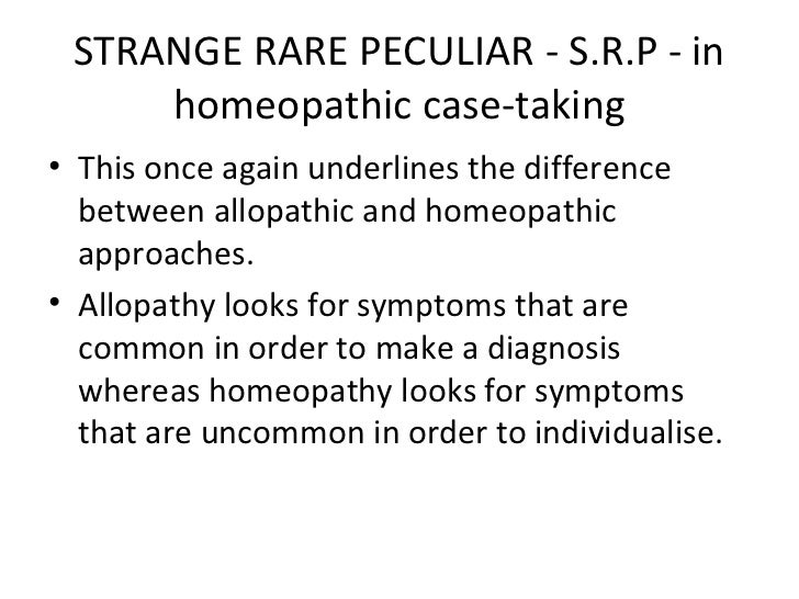 - 112. STRANGE RARE PECULIAR - S.R.P - in homeopathic case-taking• This once again underlines the difference between allopathic and homeopathic approaches.• Allopathy looks for symptoms that are common in order to make a diagnosis whereas homeopathy looks for symptoms that are uncommon in order to individualise.