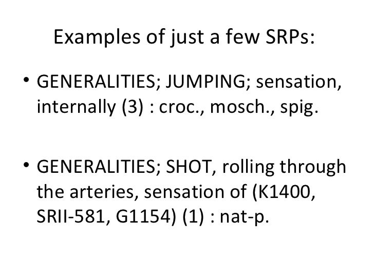 - 113. Examples of just a few SRPs:• GENERALITIES; JUMPING; sensation, internally (3) : croc., mosch., spig.• GENERALITIES; SHOT, rolling through the arteries, sensation of (K1400, SRII-581, G1154) (1) : nat-p.