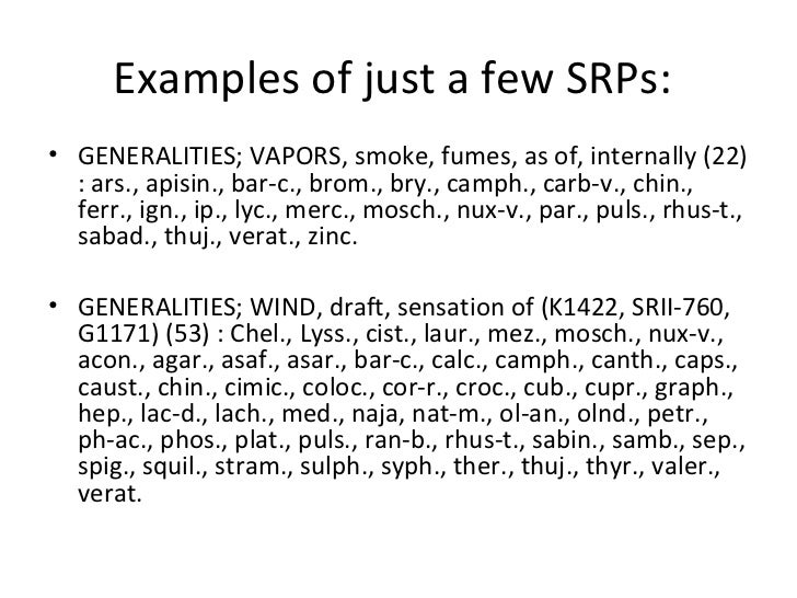 - 114. Examples of just a few SRPs:• GENERALITIES; VAPORS, smoke, fumes, as of, internally (22) : ars., apisin., bar-c., brom., bry., camph., carb-v., chin., ferr., ign., ip., lyc., merc., mosch., nux-v., par., puls., rhus-t., sabad., thuj., verat., zinc.• GENERALITIES; WIND, draft, sensation of (K1422, SRII-760, G1171) (53) : Chel., Lyss., cist., laur., mez., mosch., nux-v., acon., agar., asaf., asar., bar-c., calc., camph., canth., caps., caust., chin., cimic., coloc., cor-r., croc., cub., cupr., graph., hep., lac-d., lach., med., naja, nat-m., ol-an., olnd., petr., ph-ac., phos., plat., puls., ran-b., rhus-t., sabin., samb., sep., spig., squil., stram., sulph., syph., ther., thuj., thyr., valer., verat.