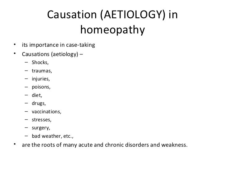 - 115. Causation (AETIOLOGY) in homeopathy• its importance in case-taking• Causations (aetiology) – – Shocks, – traumas, – injuries, – poisons, – diet, – drugs, – vaccinations, – stresses, – surgery, – bad weather, etc.,• are the roots of many acute and chronic disorders and weakness.