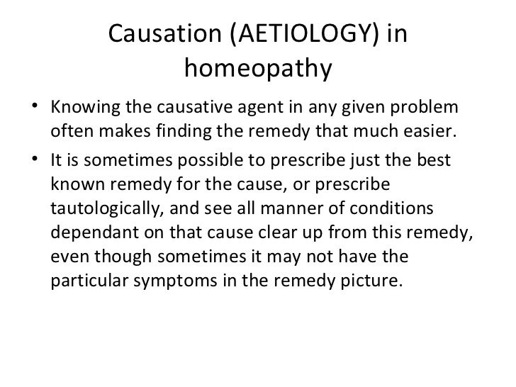 - 116. Causation (AETIOLOGY) in homeopathy• Knowing the causative agent in any given problem often makes finding the remedy that much easier.• It is sometimes possible to prescribe just the best known remedy for the cause, or prescribe tautologically, and see all manner of conditions dependant on that cause clear up from this remedy, even though sometimes it may not have the particular symptoms in the remedy picture.