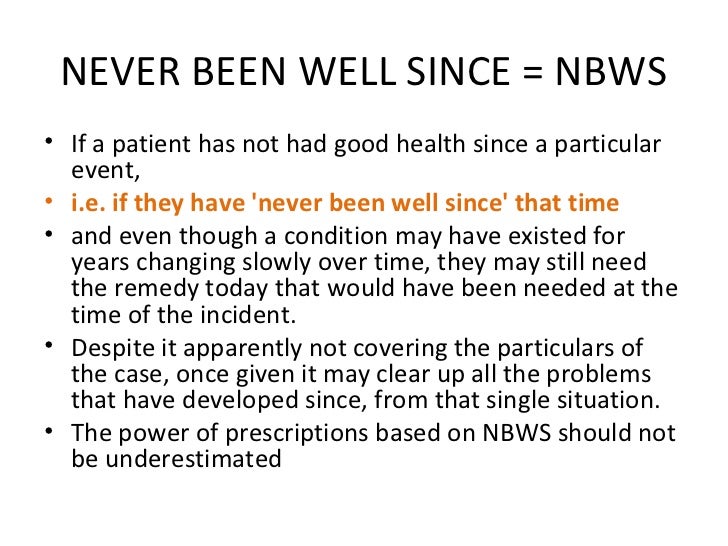 - 117. NEVER BEEN WELL SINCE = NBWS• If a patient has not had good health since a particular event,• i.e. if they have never been well since that time• and even though a condition may have existed for years changing slowly over time, they may still need the remedy today that would have been needed at the time of the incident.• Despite it apparently not covering the particulars of the case, once given it may clear up all the problems that have developed since, from that single situation.• The power of prescriptions based on NBWS should not be underestimated