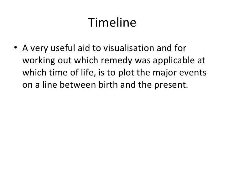 - 118. Timeline• A very useful aid to visualisation and for working out which remedy was applicable at which time of life, is to plot the major events on a line between birth and the present.
