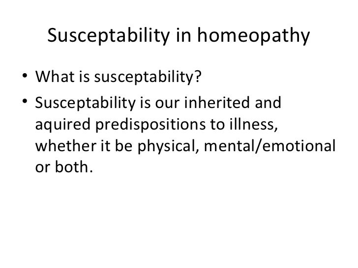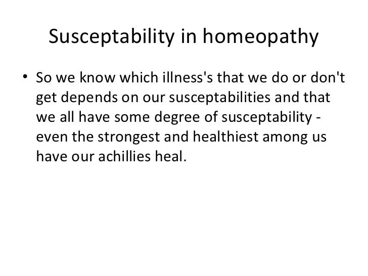- 119. Susceptability in homeopathy• What is susceptability?• Susceptability is our inherited and aquired predispositions to illness, whether it be physical, mental/emotional or both.