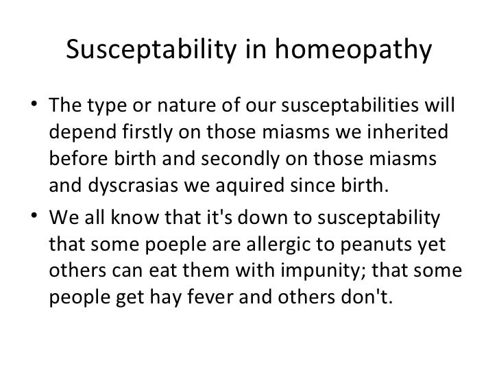 - 120. Susceptability in homeopathy• The type or nature of our susceptabilities will depend firstly on those miasms we inherited before birth and secondly on those miasms and dyscrasias we aquired since birth.• We all know that its down to susceptability that some poeple are allergic to peanuts yet others can eat them with impunity; that some people get hay fever and others dont.