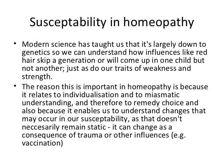 - 122. Susceptability in homeopathy• Modern science has taught us that its largely down to genetics so we can understand how influences like red hair skip a generation or will come up in one child but not another; just as do our traits of weakness and strength.• The reason this is important in homeopathy is because it relates to individualisation and to miasmatic understanding, and therefore to remedy choice and also because it enables us to understand changes that may occur in our susceptability, as that doesnt neccesarily remain static - it can change as a consequence of trauma or other influences (e.g. vaccination)