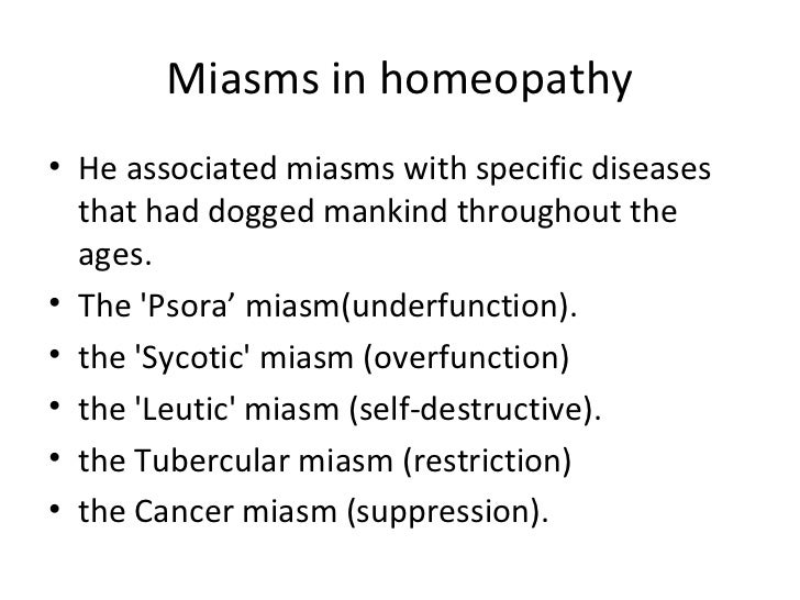 - 123. Miasms in homeopathy• He associated miasms with specific diseases that had dogged mankind throughout the ages.• The Psora’ miasm(underfunction).• the Sycotic miasm (overfunction)• the Leutic miasm (self-destructive).• the Tubercular miasm (restriction)• the Cancer miasm (suppression).