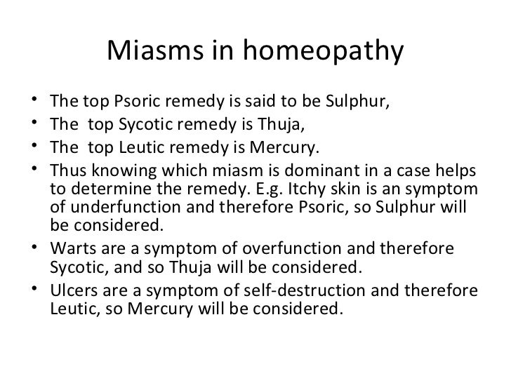- 124. Miasms in homeopathy• The top Psoric remedy is said to be Sulphur,• The top Sycotic remedy is Thuja,• The top Leutic remedy is Mercury.• Thus knowing which miasm is dominant in a case helps to determine the remedy. E.g. Itchy skin is an symptom of underfunction and therefore Psoric, so Sulphur will be considered.• Warts are a symptom of overfunction and therefore Sycotic, and so Thuja will be considered.• Ulcers are a symptom of self-destruction and therefore Leutic, so Mercury will be considered.