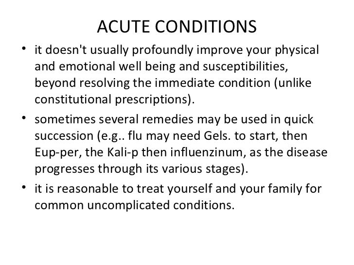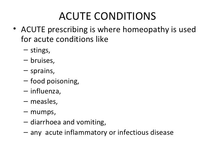 - 126. ACUTE CONDITIONS• ACUTE prescribing is where homeopathy is used for acute conditions like – stings, – bruises, – sprains, – food poisoning, – influenza, – measles, – mumps, – diarrhoea and vomiting, – any acute inflammatory or infectious disease
