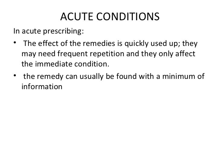 - 127. ACUTE CONDITIONS In acute prescribing:• The effect of the remedies is quickly used up; they may need frequent repetition and they only affect the immediate condition.• the remedy can usually be found with a minimum of information