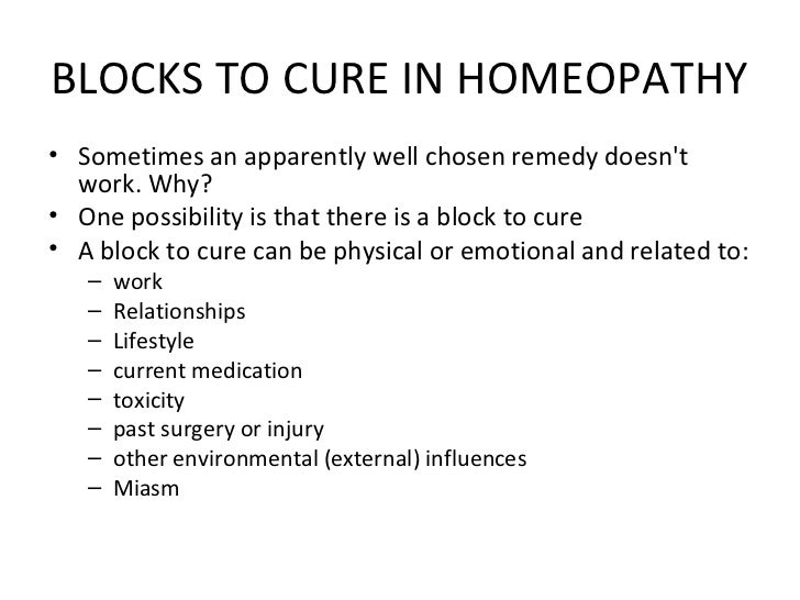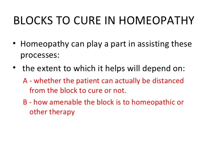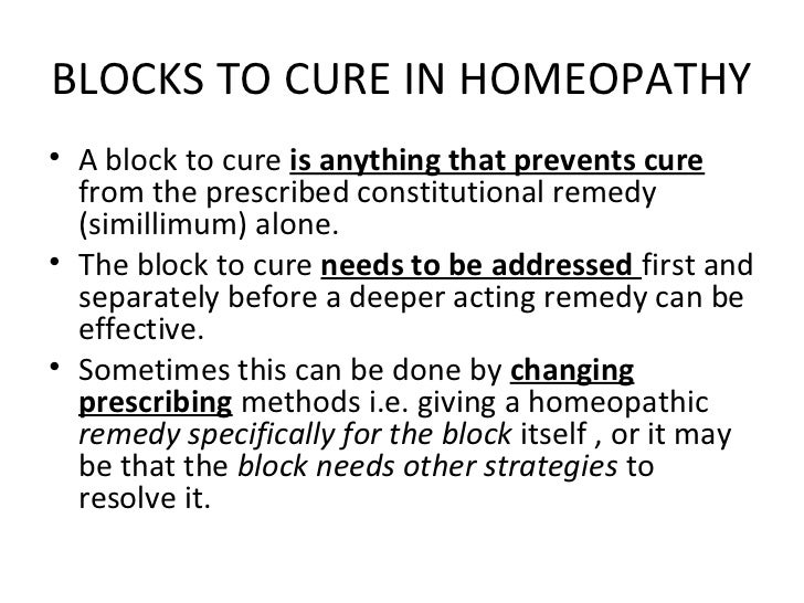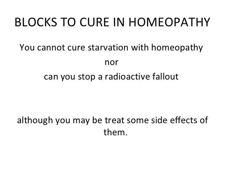 - 132. BLOCKS TO CURE IN HOMEOPATHY You cannot cure starvation with homeopathy nor can you stop a radioactive fall out although you may be treat some side effects of them.