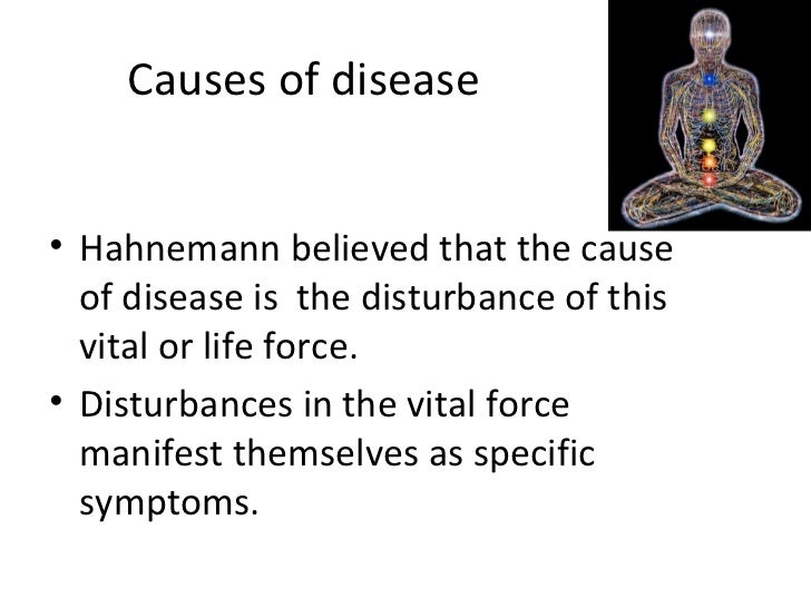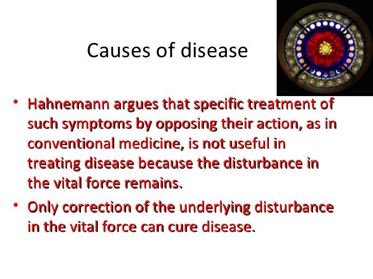 - 18. Causes of disease• Hahnemann argues that specific treatment of such symptoms by opposing their action, as in conventional medicine, is not useful in treating disease because the disturbance in the vital force remains.• Only correction of the underlying disturbance in the vital force can cure disease.