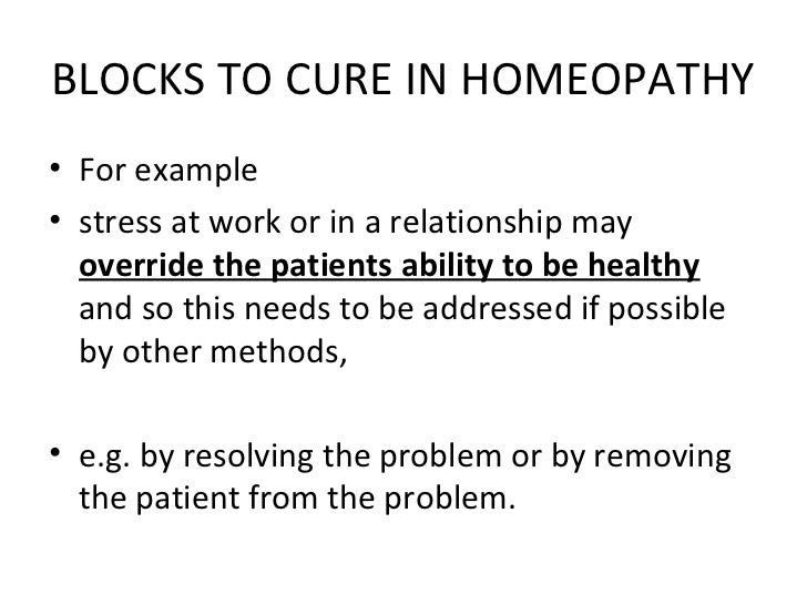 - 133. BLOCKS TO CURE IN HOMEOPATHY• For example• stress at work or in a relationship may override the patients ability to be healthy and so this needs to be addressed if possible by other methods,• e.g. by resolving the problem or by removing the patient from the problem.