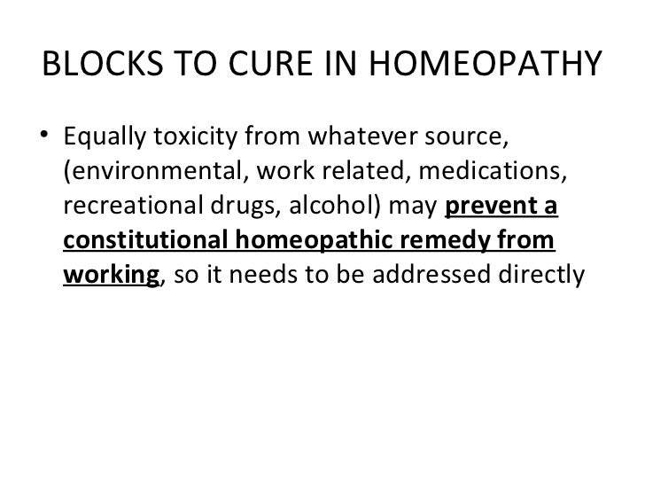 - 134. BLOCKS TO CURE IN HOMEOPATHY• Equally toxicity from whatever source, (environmental, work related, medications, recreational drugs, alcohol) may prevent a constitutional homeopathic remedy from working, so it needs to be addressed directly
