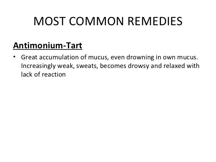 - 137. MOST COMMON REMEDIES Antimonium-Tart• Great accumulation of mucus, even drowning in own mucus. Increasingly weak, sweats, becomes drowsy and relaxed with lack of reaction