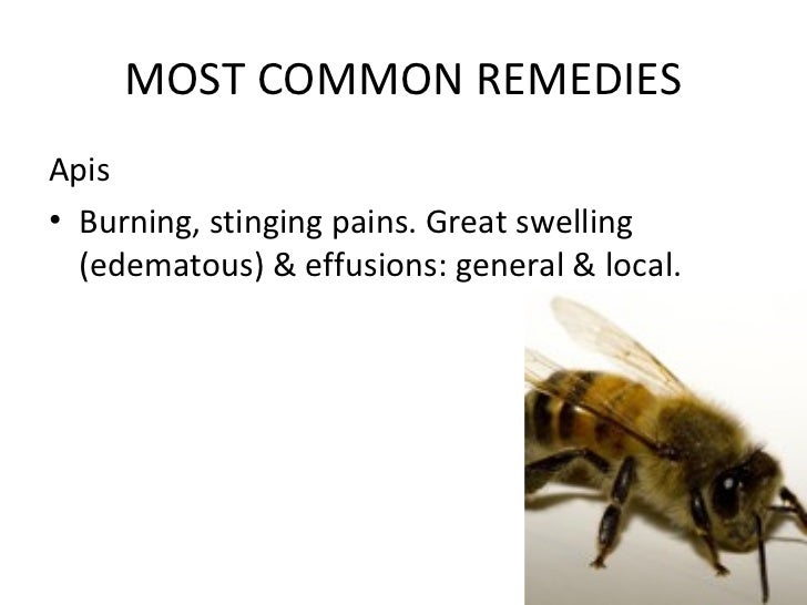 - 138. MOST COMMON REMEDIES Apis• Burning, stinging pains. Great swelling (edematous) & effusions: general & local.
