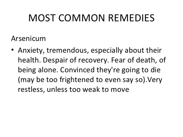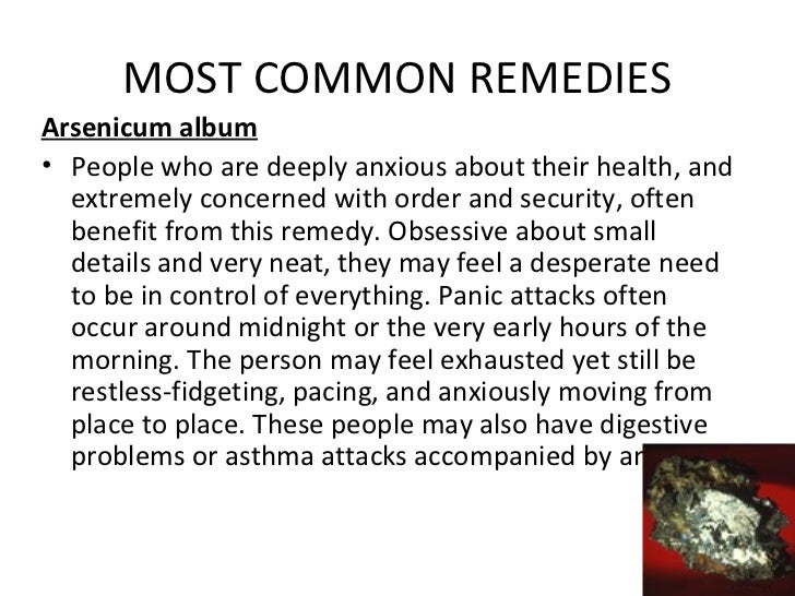 - 153. MOST COMMON REMEDIES Arsenicum album• People who are deeply anxious about their health, and extremely concerned with order and security, often benefit from this remedy. Obsessive about small details and very neat, they may feel a desperate need to be in control of everything. Panic attacks often occur around midnight or the very early hours of the morning. The person may feel exhausted yet still be restless-fidgeting, pacing, and anxiously moving from place to place. These people may also have digestive problems or asthma attacks accompanied by anxiety.
