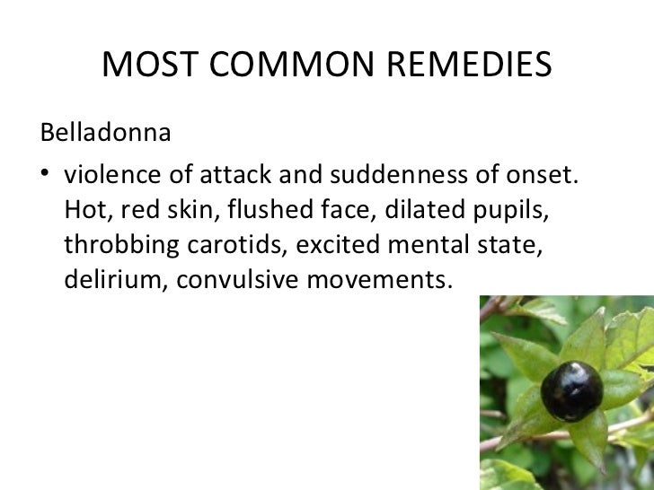 - 140. MOST COMMON REMEDIES Belladonna• violence of attack and suddenness of onset. Hot, red skin, flushed face, dilated pupils, throbbing carotids, excited mental state, delirium, convulsive movements.