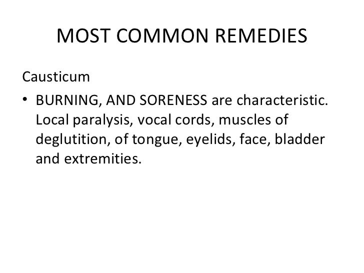 - 141. MOST COMMON REMEDIES Causticum• BURNING, AND SORENESS are characteristic. Local paralysis, vocal cords, muscles of deglutition, of tongue, eyelids, face, bladder and extremities.