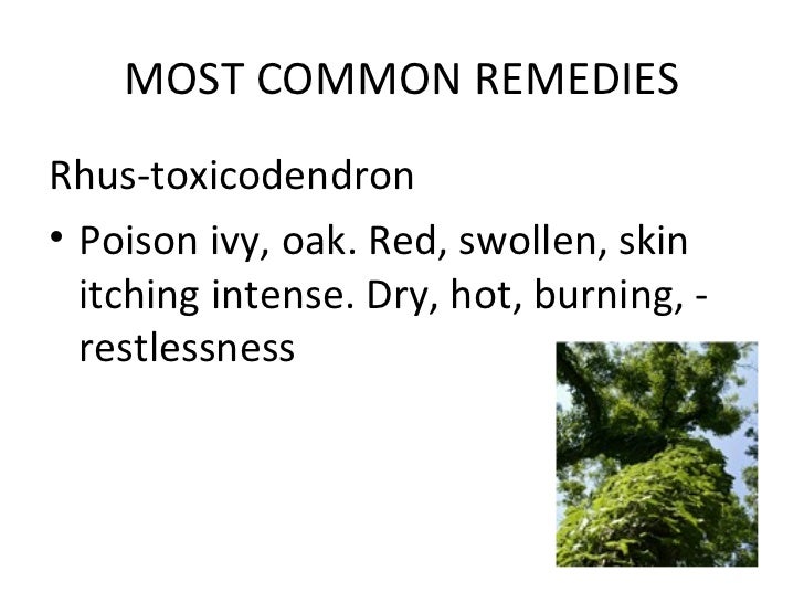 - 142. MOST COMMON REMEDIES Rhus-toxicodendron• Poison ivy, oak. Red, swollen, skin itching intense. Dry, hot, burning, - restlessness