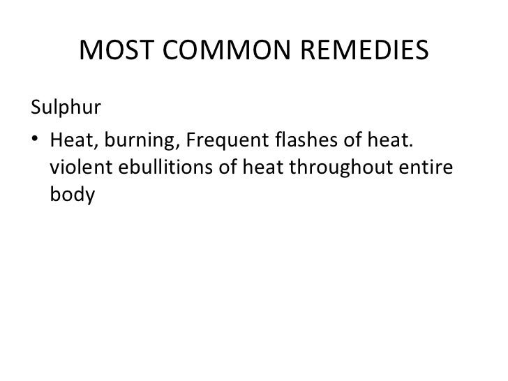 - 143. MOST COMMON REMEDIES Sulphur• Heat, burning, Frequent flashes of heat. violent ebullitions of heat throughout entire body