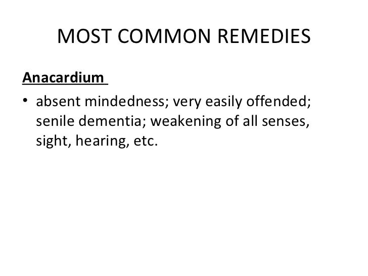 - 144. MOST COMMON REMEDIES Anacardium• absent mindedness; very easily offended; senile dementia; weakening of all senses, sight, hearing, etc.