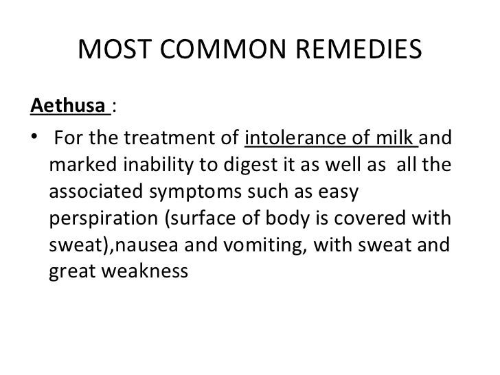 - 145. MOST COMMON REMEDIES Aethusa :• For the treatment of intolerance of milk and marked inability to digest it as well as all the associated symptoms such as easy perspiration (surface of body is covered with sweat),nausea and vomiting, with sweat and great weakness