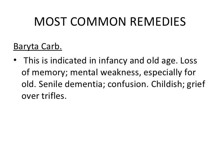 - 147. MOST COMMON REMEDIES Baryta Carb.• This is indicated in infancy and old age. Loss of memory; mental weakness, especially for old. Senile dementia; confusion. Childish; grief over trifles.