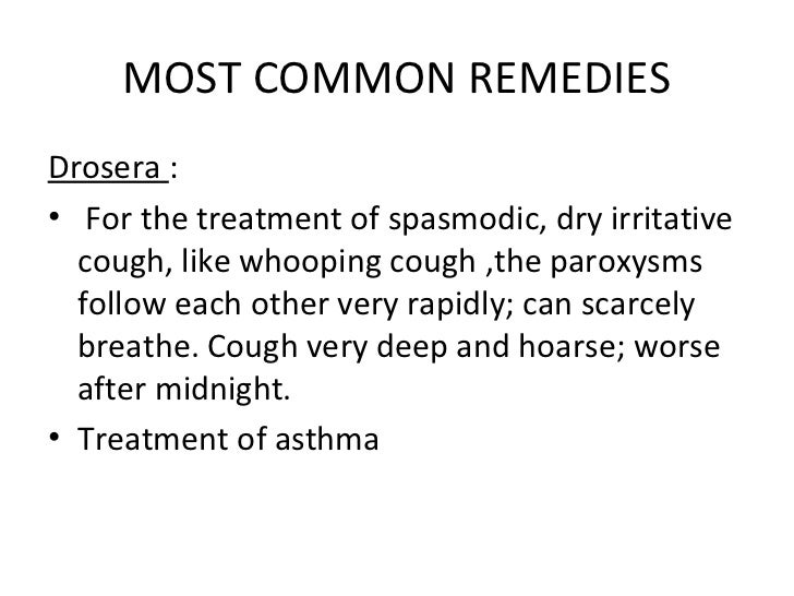 - 148. MOST COMMON REMEDIES Drosera :• For the treatment of spasmodic, dry irritative cough, like whooping cough ,the paroxysms follow each other very rapidly; can scarcely breathe. Cough very deep and hoarse; worse after midnight.• Treatment of asthma