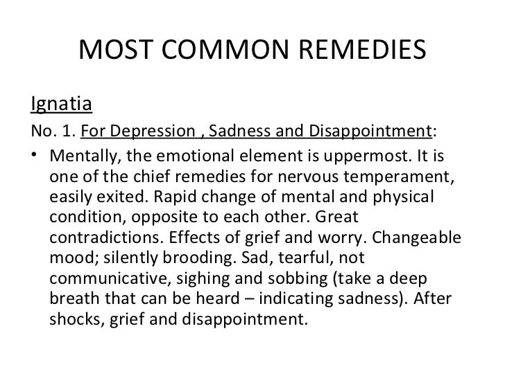 - 149. MOST COMMON REMEDIES Ignatia No. 1. For Depression , Sadness and Disappointment:• Mentally, the emotional element is uppermost. It is one of the chief remedies for nervous temperament, easily exited. Rapid change of mental and physical condition, opposite to each other. Great contradictions. Effects of grief and worry. Changeable mood; silently brooding. Sad, tearful, not communicative, sighing and sobbing (take a deep breath that can be heard – indicating sadness). After shocks, grief and disappointment.