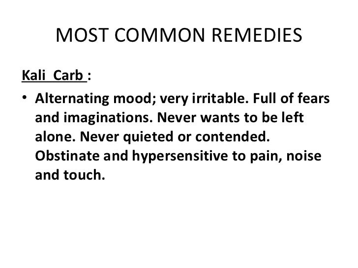 - 150. MOST COMMON REMEDIES Kali Carb :• Alternating mood; very irritable. Full of fears and imaginations. Never wants to be left alone. Never quieted or contended. Obstinate and hypersensitive to pain, noise and touch.