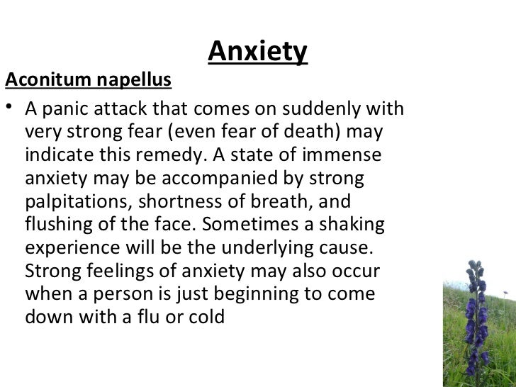 - 151. Anxiety Aconitum napellus• A panic attack that comes on suddenly with very strong fear (even fear of death) may indicate this remedy. A state of immense anxiety may be accompanied by strong palpitations, shortness of breath, and flushing of the face. Sometimes a shaking experience will be the underlying cause. Strong feelings of anxiety may also occur when a person is just beginning to come down with a flu or cold