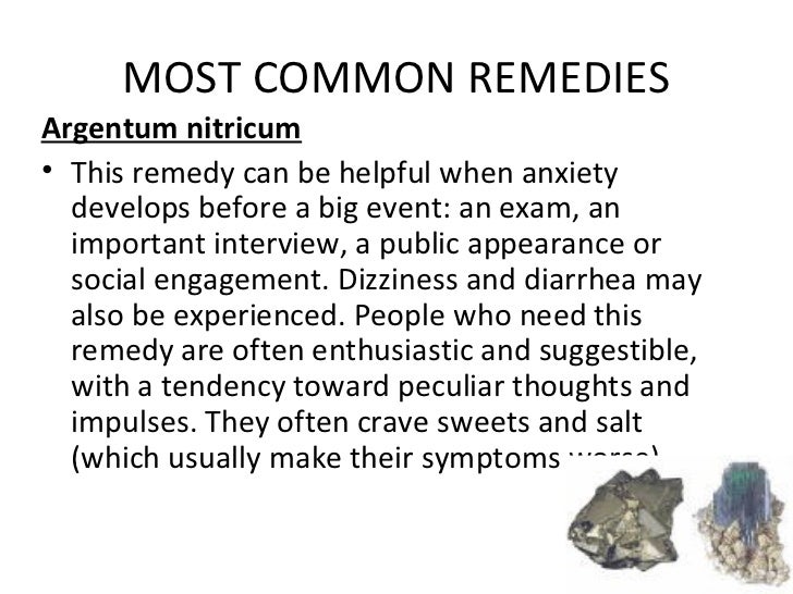 - 152. MOST COMMON REMEDIES Argentum nitricum• This remedy can be helpful when anxiety develops before a big event: an exam, an important interview, a public appearance or social engagement. Dizziness and diarrhea may also be experienced. People who need this remedy are often enthusiastic and suggestible, with a tendency toward peculiar thoughts and impulses. They often crave sweets and salt (which usually make their symptoms worse).