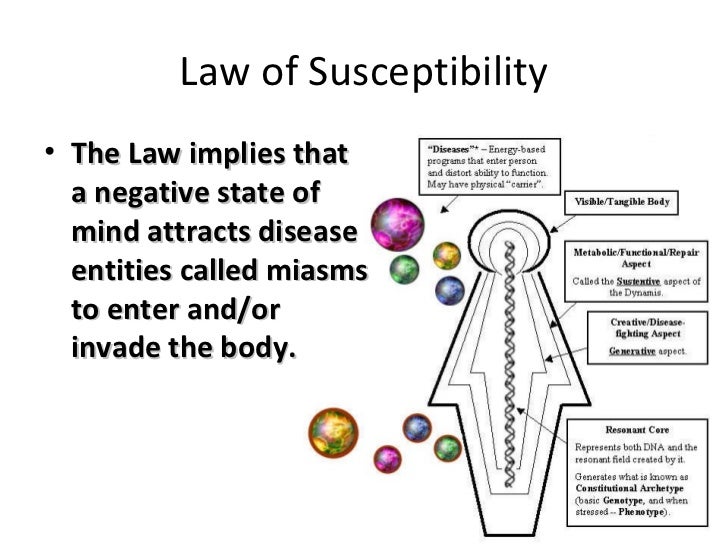 - 16. Law of Susceptibility• The Law implies that a negative state of mind attracts disease entities called miasms to enter and/or invade the body.