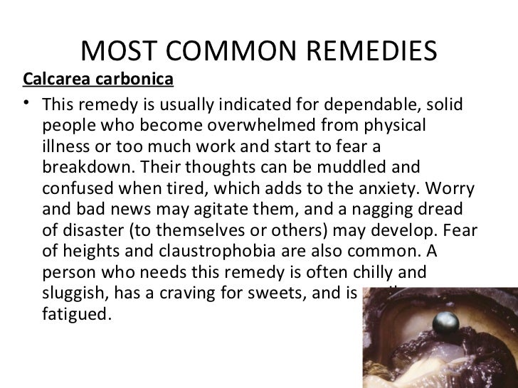 - 154. MOST COMMON REMEDIES Calcarea carbonica• This remedy is usually indicated for dependable, solid people who become overwhelmed from physical illness or too much work and start to fear a breakdown. Their thoughts can be muddled and confused when tired, which adds to the anxiety. Worry and bad news may agitate them, and a nagging dread of disaster (to themselves or others) may develop. Fear of heights and claustrophobia are also common. A person who needs this remedy is often chilly and sluggish, has a craving for sweets, and is easily fatigued.