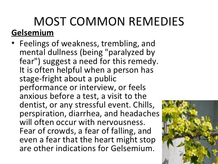 - 155. MOST COMMON REMEDIES Gelsemium• Feelings of weakness, trembling, and mental dullness (being "paralyzed by fear") suggest a need for this remedy. It is often helpful when a person has stage-fright about a public performance or interview, or feels anxious before a test, a visit to the dentist, or any stressful event. Chills, perspiration, diarrhea, and headaches will often occur with nervousness. Fear of crowds, a fear of falling, and even a fear that the heart might stop are other indications for Gelsemium.
