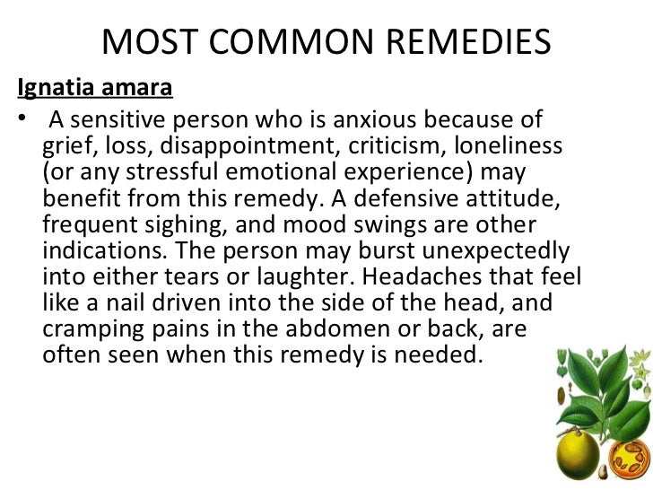 - 156. MOST COMMON REMEDIES Ignatia amara• A sensitive person who is anxious because of grief, loss, disappointment, criticism, loneliness (or any stressful emotional experience) may benefit from this remedy. A defensive attitude, frequent sighing, and mood swings are other indications. The person may burst unexpectedly into either tears or laughter. Headaches that feel like a nail driven into the side of the head, and cramping pains in the abdomen or back, are often seen when this remedy is needed.