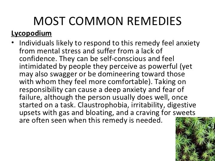 - 158. MOST COMMON REMEDIES Lycopodium• Individuals likely to respond to this remedy feel anxiety from mental stress and suffer from a lack of confidence. They can be self-conscious and feel intimidated by people they perceive as powerful (yet may also swagger or be domineering toward those with whom they feel more comfortable). Taking on responsibility can cause a deep anxiety and fear of failure, although the person usually does well, once started on a task. Claustrophobia, irritability, digestive upsets with gas and bloating, and a craving for sweets are often seen when this remedy is needed.